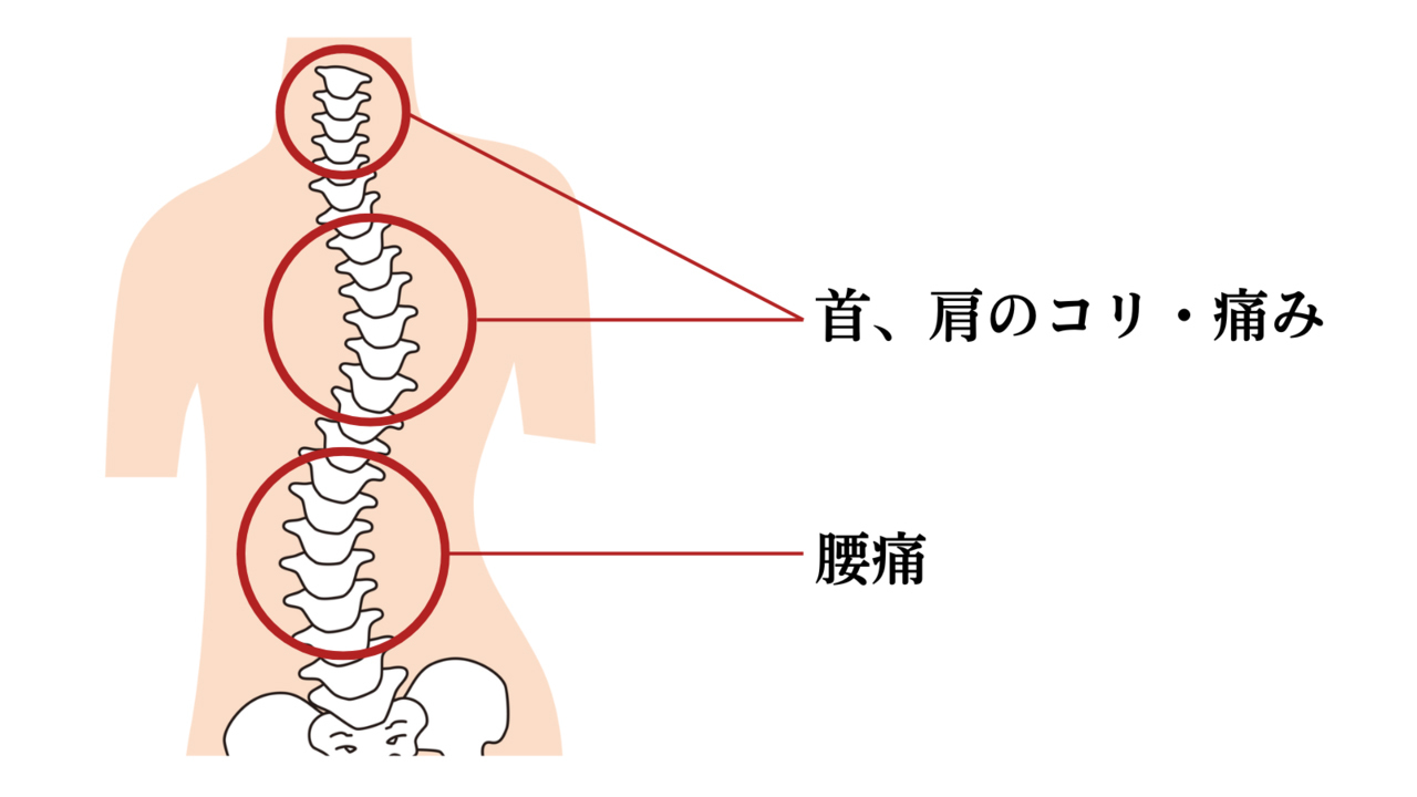 この歪みが、首・肩・腰の筋肉に余計な負担をかけることになり、この負担によって筋肉が硬直。