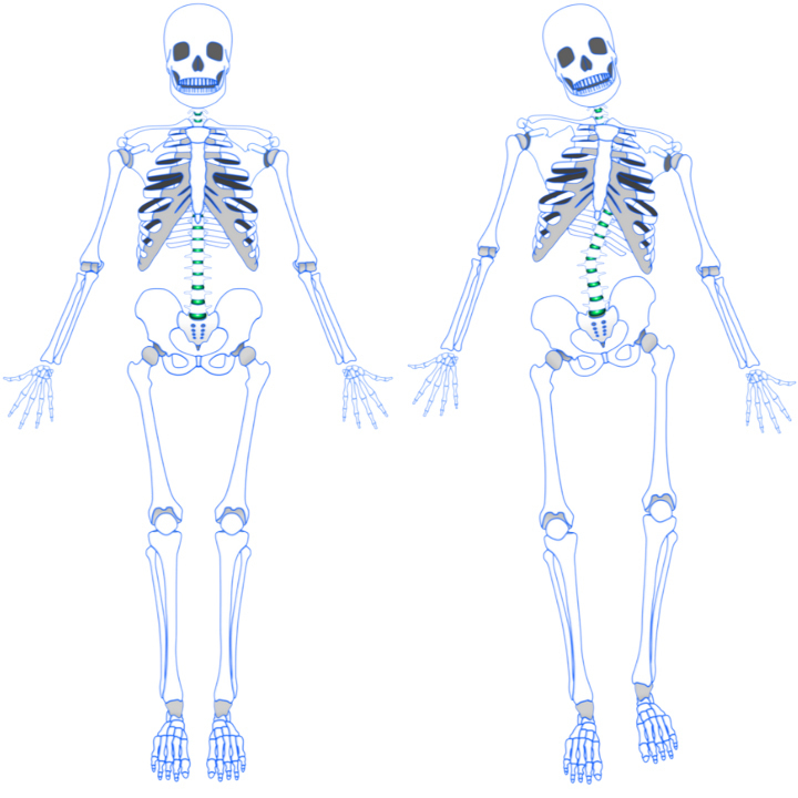 左が正常な状態で、右が頭が傾いた結果、無理にバランスを取ろうとしてる状態です。骨格がかなり歪んでしまっているのがわかりますね。